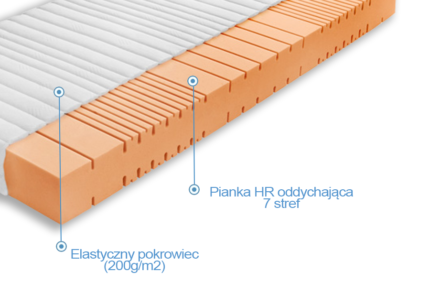 Materac Torin to wysokoelastyczny materac piankowy HR PREMIUM z pianki HR Comfort — 290% wytrzymalszej od standardowej. 7 stref komfortu