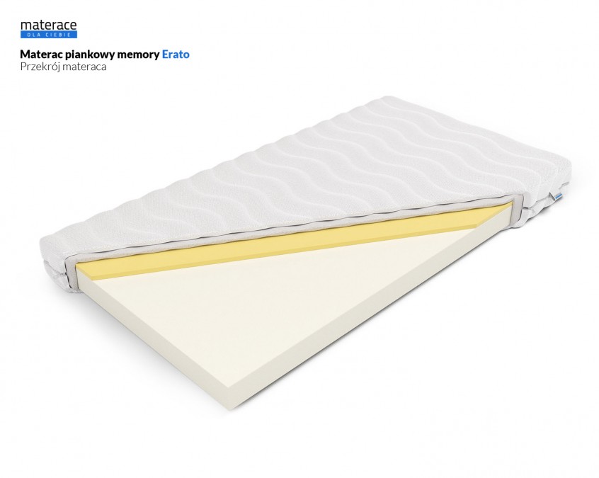 Materac Erato – Materac piankowy z warstwą VISCO memory. Dwie twardości: miękka H1 (memory) lub średnio-twarda H2 (pianka). Dopasowuje się do ciała, nie przenosi drgań.