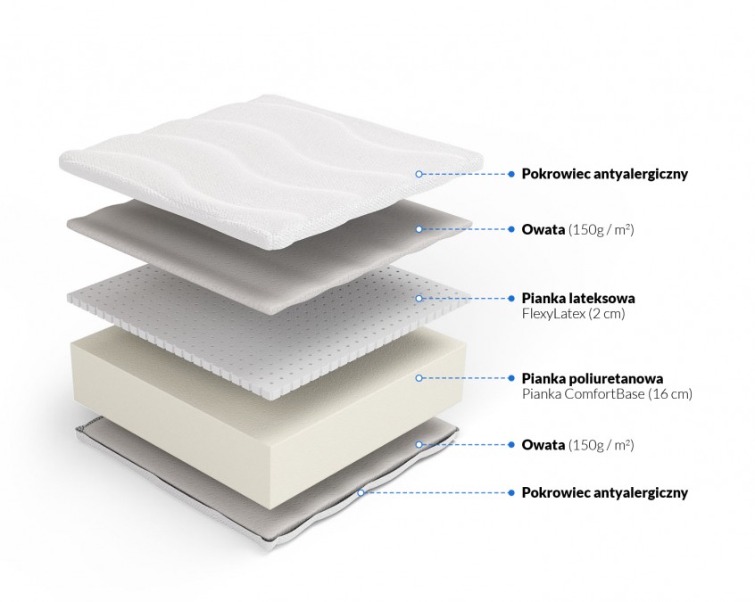 FlexyLateks łączy sprężystość naturalnego lateksu z komfortem pianki poliuretanowej — właściwości ortopedyczne, naturalna elastyczność i wytrzymałość.