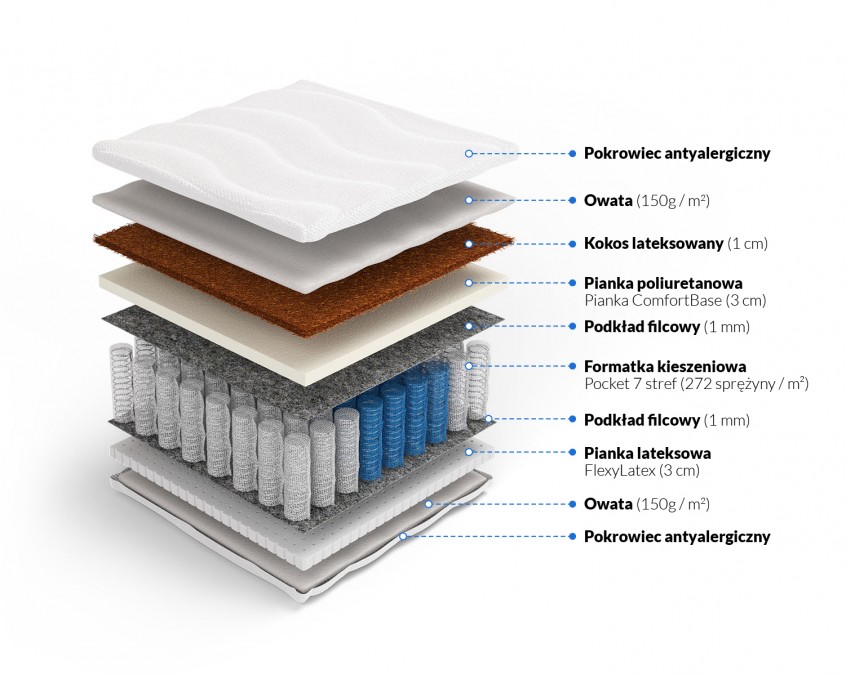 7 stref twardości i FlexyLateks zapewniają właściwości ortopedyczne — precyzyjne podparcie każdej partii ciała przez całą noc. Wszystkie komponenty antyalergiczne.