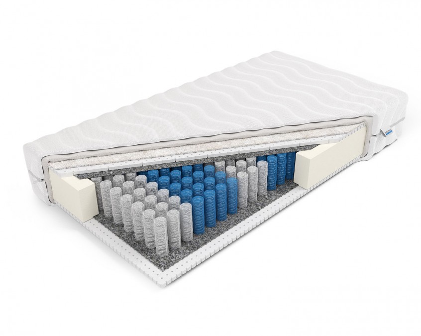 Materac Euros to sprężynowy kieszeniowy z 272 sprężynami na m² w 7 strefach twardości, pianką FlexyLateks symetrycznie z obu stron i naturalną owczą wełną. 17 cm wysokości, twardość H2 obustronnie i 10-letnia gwarancja. Wełna owcza nadaje materacowi wyjątkowe właściwości lecznicze i rehabilitacyjne — polecany szczególnie przy schorzeniach kręgosłupa i reumatyzmie.