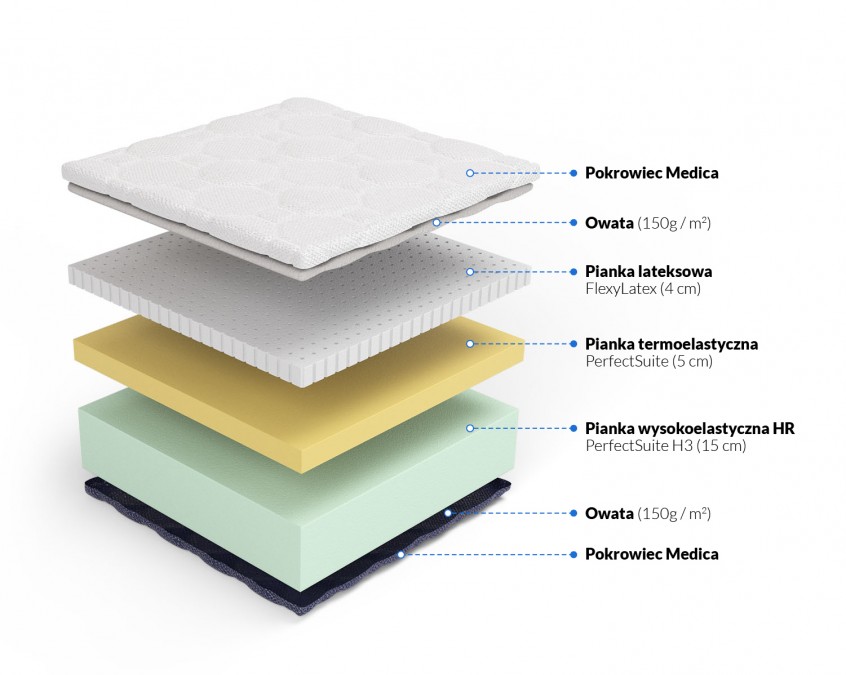 Materac Sensit H3 to 25-centymetrowy materac piankowy premium z trzema warstwami o odmiennych funkcjach — FlexyLateks 4 cm na sprężystą powierzchnię, PerfectSuite VISCO 5 cm dla precyzyjnego dopasowania do ciała i HR FreshElastic jako stabilna, trwała baza. Twardość H3 obustronnie, dedykowany osobom od 80 kg szukającym twardego komfortu premium.
