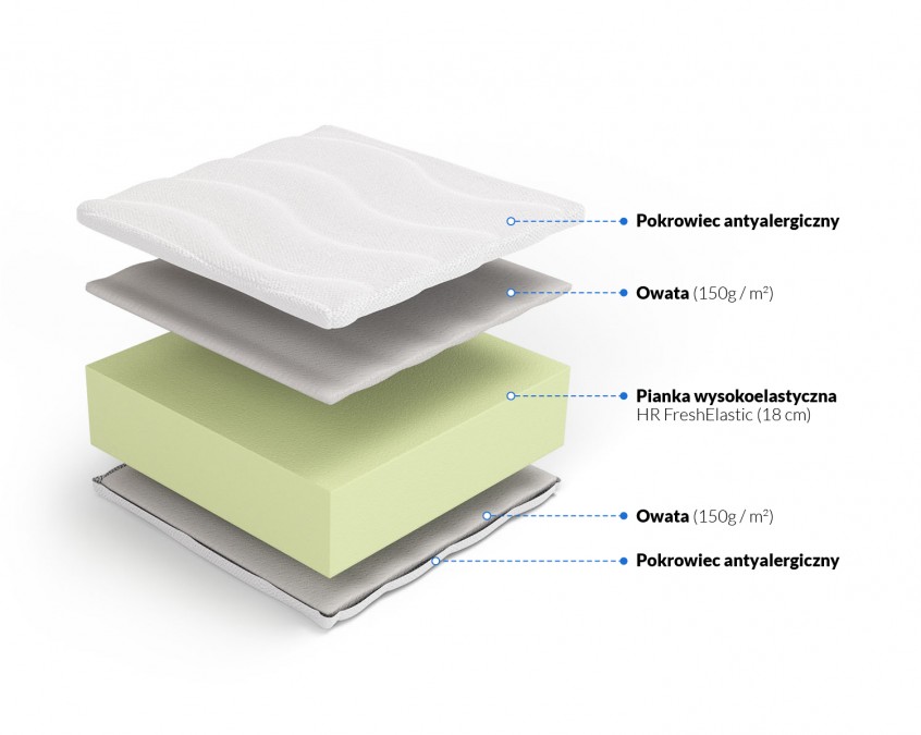 Aż 18 cm pianki HR FreshElastic to o 3 cm więcej niż w wersji Mojry 15 cm — większy komfort, lepsze dopasowanie do ciała i wyższa trwałość. Doskonały do stelaży regulowanych.