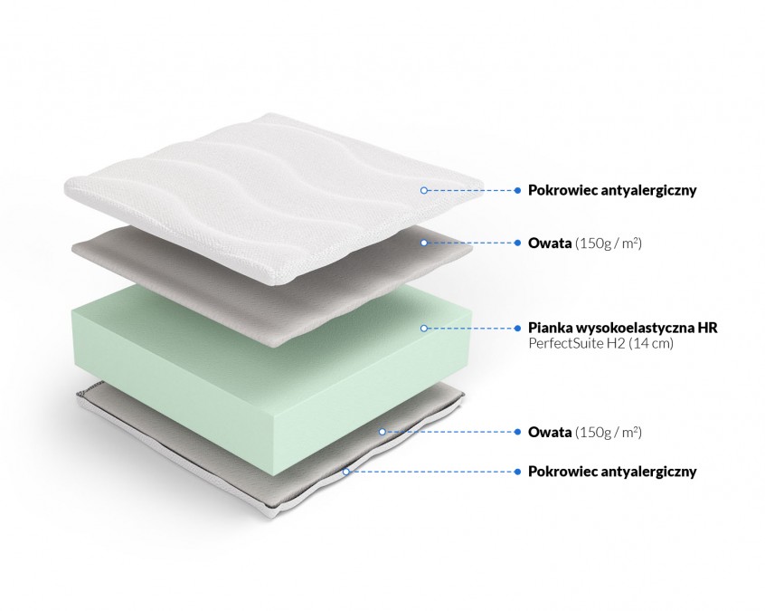 Pianka HR FreshElastic błyskawicznie wraca do formy po każdym nacisku, doskonale wentyluje i odprowadza wilgoć. Elastyczność punktowa reaguje na każdą zmianę pozycji — spokojny sen przez całą noc.