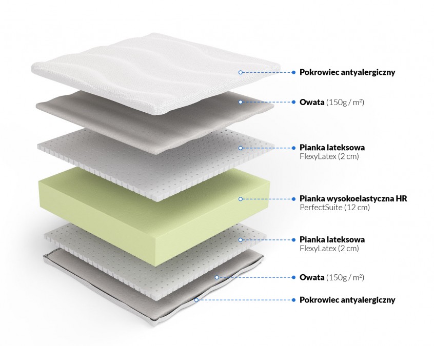 Materac Tanatos to wysokoelastyczny piankowy z 3 warstwami — FlexyLateks 2 cm, rdzeń HR FreshElastic 12 cm i FlexyLateks 2 cm. 16 cm wysokości, twardość H2 obustronnie, jednolita powierzchnia bez stref. Lateks z obu stron zapewnia naturalną antyalergiczność i doskonałą wentylację, rdzeń HR szybko reaguje na zmianę pozycji. 2 lata gwarancji na wkład piankowy.
