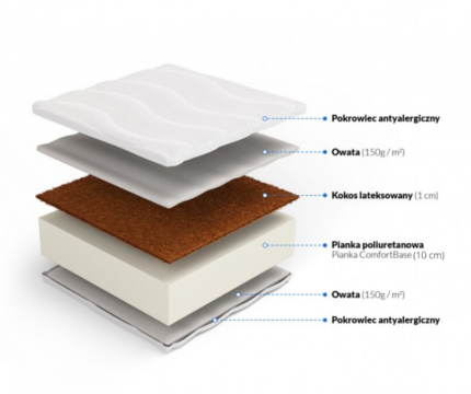 Materac Kalliope – Materac piankowy z warstwą kokosu lateksowanego. Dwie twardości: średnio-twarda H2 (pianka) lub twarda H3 (kokos). Trwały, przewiewny,