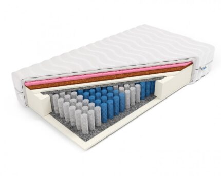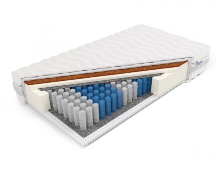 Materac Hera to kontynentalny system 4-warstwowy z twardym charakterem — FlexyLateks 2 cm, kokos lateksowany 3 cm, sprężyny kieszeniowe w